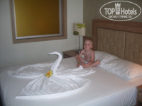 Мы приехали в отель к 8 утра. Нас сразу отправили на завтрак. После завтрака мы переодели купальники и пошли к бассейнам. Настроение заметно улучшилось в 10.00, когда пришли аниматоры. Приятная музыка, "Доброе утро" от команды аниматоров и, кажется, все наладилось. Заселили нас к 11 утра. Вид из номера - ужасный, но нас это не напрягало, так как на балкон мы выходили только для того, чтобы повесить купальники или полотенца. Номер хороший: кондиционер работал исправно, белоснежные простыни и полотенца менялись своевременно, уборка в номере - ежедневно. Очень приятно было заходить в номер после уборки - на кровати нас встречали красивые лебеди, сердечки и бантики. Спасибо!