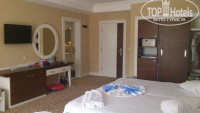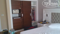 По сути номер конечно не люкс, а просто стандарт в нормальной пятерке: свежий ремонт, сейф, большая ванная комната, современный телевизор и кондиционер. Тапок и халатов не было. В холодильнике две больших бутылки с водой, литровая бутылка пепси и литровая бутылка фанты (пополнялись раз в три дня примерно). Набора для чая и кофе не было. Насекомых в номере не было. Один раз ненадолго вырубилось электричество. Уборка каждый день, полотенца менялись по требованию, постельное меняли раз в 3-4 дня. Детскую кроватку принесли после нескольких напоминаний через два дня).