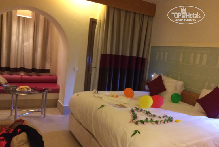Прилетели поздно ночью, заселили тут же, подарили номер с видом на море, украсили его и принесли очень вкусный тортик! Персонал на стойке очень вежливый и внимательный (всегда выполняли наши просьбы - будильник и сухой паек когда были экскурсии) В номере было все что необходимо: удобная мягкая большая кровать, кондиционер всегда исправно работал, был фен (не очень мощный но на море больше и не нужно) телевизор (куча каналов на всех языках мира) в отеле 12 корпусов (как 12 знаков зодиака) мы были в скорпионе в комнате 2220, вид в балкона просто захватывал дух! Мастер чистоты хорошо и каждый день убирал наш номер и ставил 2 бутылочки воды, (мы иногда давали чаевые, тогда еще лучше убирали) Питание в отеле лучше не придумать (не верьте плохим комментариям касательно еды) столько разнообразия я не видела нигде (мы были ранее в хургаде и в турции , про европу вообще молчу) на завтрак: овсянка, рисовая каша, хлопья, блины, яичница, сладости, на обед курица в разном приготовлении, салаты, овощи, рыба, жаренные кольца кальмара, все виды гарнира, и огромное количество тортов и все разные!!! Я не знаю как они делают такой вкусный сливочный крем....Еда подается с самого утра и до позднего вечера...есть бар у пляжа с закусками (пицца, гамбургеры, фри, пиво, алкоголь, фреш гуавы, клубники и манго за 3.5 доллара - кстати не берите не совсем он был таким как я думала - оказалось это было пюре густое но не сок ) в общем питание было очень хорошим, может конечно не велик выбор фруктов (дыни, арбузы, апельсины, финики, памело) а вот алкоголь конечно пить невозможно разве только пиво (которого нужно выпить оч много прежде чем хоть чуть чуть напиться) Территория не очень большая, но погулять и посмотреть вам хватит, большой бассейн (искупались всего один раз) есть коралловый риф (берите маски и ласты) давно столько разных рыб не видела! очень красиво! заход в море плавный, вода чистейшая и прозрачная! места всем хватало и все были отдалены друг от друга! На территории есть магазины, сувениры,ювелирка, аптека, одежда, рестораны (в средиземный можно сходить один раз бесплатно, неплохая еда, сходите попробуйте) В отеле русских было совсем мало, в основном одни немцы, англичане и французы! Я настоятельно вам рекомендую съездить сюда и отдохнуть! Вам понравится!