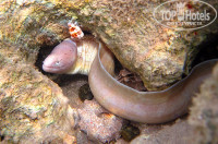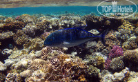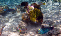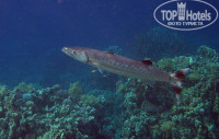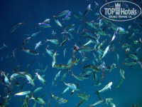 Ближе к закату, если был прилив, просто ползали над рифом нашего пляжа( муренки, крылатки, актинии с амфиприонами, ежи и прочая мелочь есть).В общем на рифе есть весь набор красноморских рыб: три наполеона (один покрупнее, два поменьше), видели их встречу на повороте от МШ к МС. Там же в последнее утро встретился приличный картофельный группер и два мелких. Барракуда побольше метра встретилась между Сенсатори и Бароном на очистке,но сразу ушла в синьку.