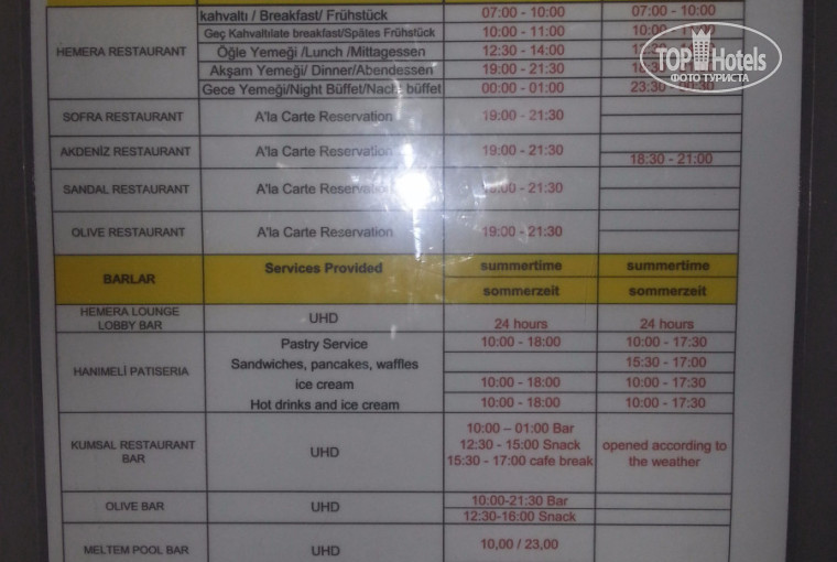 А ля карт рестораны. Посетили Акдениз. Было очень вкусно, но большой разницы с общим рестораном, кроме более внимательного обслуживания и изысканного оформления блюд, не заметил. Между основными приемами пищи вкусно кормят в барах. В баре около бассейнов дают курочку а ля KFC, крошку-картошку и картофель фри, в баре у пляжа кормят пиццей, пиде и фруктами.