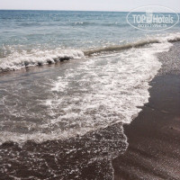 На пляже достаточное количество лежаков и матрасов, вход в море с камушками, песка нет. Если проплыть чуть подальше, в воде есть плита.