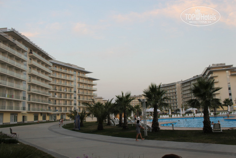 огромный отель, территория зеленая, есть 5 открытых бассейнов, несколько магазинчиков, несколько ресторанов