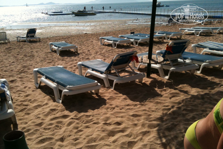 На пляже лежаков не хватает на всех, надо приходить прямо с утра после завтрака в 7-30, либо после 16. Через изгородь у соседей лежаки все свободные, но у них хуже сход в воду. А у нас была широкая дорожка с площадкой на воде. 2 песчаные дорожки в воде. Вода с видимостью в 5 метров. Рыбки немного, но есть. Маленьких рыбок была целая стая. Коралы в основном мертвые.