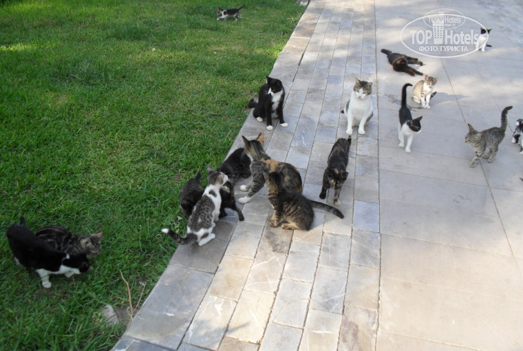 Территория осталась в наследство от былого величия этого отеля. Нам очень понравилась, хоть и небольшая, но ухоженная и вся утопает в зелени, в цветах. В бассейне плавали всего один раз, очень хлорная вода. С утра около бассейнов ещё грязно, после вечерних шоу-программ. Выход на пляж через калитку, которая открыта с 08:00 до 18:00. Далее через парк, в котором живет огромное количество кошек, по ступеням (уже в других отзывах писали - 180 ступенек) выходим на набережную к городскому пляжу.