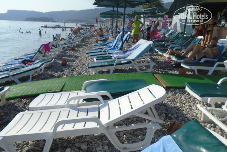 ПЛЯЖ. Это отдельная тема. Для подтверждения своих слов. можно посмотреть фото. Пляжа как такового нет. В ширину помещается 3 лежака. Вот и все. Длина тоже маленькая. Говорят, что эта часть пляжа принадлежала соседнему отелю. Кстати, wi-fi имеется на всей территории отеля, в том числе и в номерах. Это большой плюс. Т.к. с июля месяца был введен в эксплуатацию еще один корпус, то сами понимаете. что мест не хватает. Да и находится на таком пляже не очень приятно. Вход в море действительно болезненный. Я не в первый раз отдыхаю в Турции, читала много отзывов про вход в море и всегда относилась скептически. Но на 3-й день купила обувь для плавания и проблема была решена. Вообще все минусы данного отеля компенсируются великолепным морем. Чистое в любое время суток. Теплое. Шикарное. На пляже есть бар. Вода. соки. кофе-машина. Кстати, дорога до моря занимает 5-7 минут. Это плюс.