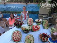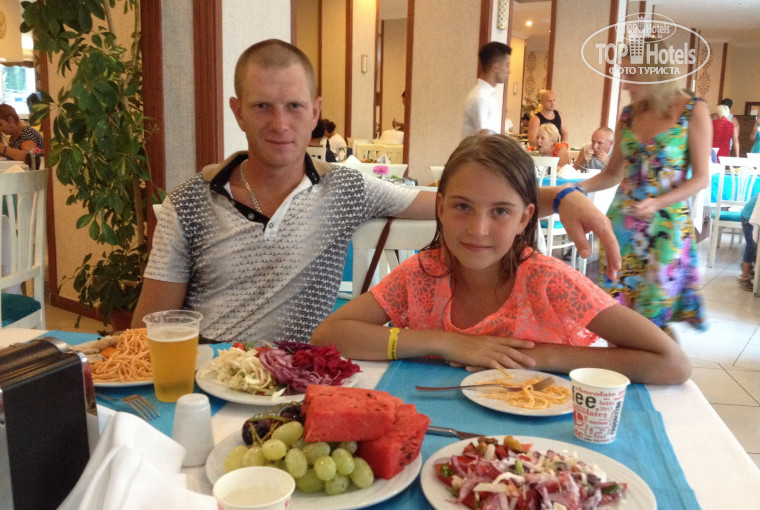 Отдыхали в отеле с 10 по 17 августа с мужем и ребенком 10 лет)Приехали вечером в 20.00 нам сказали сначала поужинайте мы пока оформим номера)После ужина заселили сразу)Номер хороший,все работало,правда мебель старая,но для нас это не проблема!Номер убирали каждый день ,правда за 1$,воду приносили тоже каждый день вместе с мылом и шампунью)Кормили хорошо из мяса была рыба,курица и говядина,из фруктов арбуз,виноград,слива!Посуда всегда чистая и хватает всем!Каждый день был хозяин)Хамам предложили один раз мы отказались,больше не навязывали!Покупали экскурсию в аквапарк у Ахмеда дешевле чем у гида!!!Правда море грязное,но т.к. Пляжи городские поэтому за чистотой не следят.Детская анимация средняя!Отель чисто семейный,тихий семейный отдых,много отдыхающих с маленькими детками!!!!Нам все понравилось если Вам не нужно вечерних развлекух,то Вам сюда!!!!