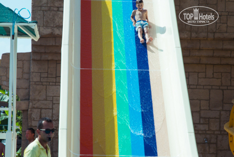 Тут все хорошо.Чисто. Горки отлично "охраняются", двое спасателей смотрят исправно. Не пускают, если занято. Никаких нареканий. Вообще, анимация ШИКАРНАЯ! все отзывчивые, позитивный, активные! Пожалуй, это лучшая анимация из всех посещенных нами отелей. Детский бассейн при нас чистили. Кстати, все бассейны сильно хлорируются, видимо поэтому никто не болеет в отеле. Но глаза болят, конечно если нырять постоянно. Но это большой плюс. Пусть лучше хлорка, чем ротовирус.