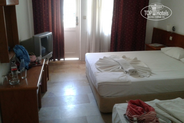 В номере: Номер оказался трехместным, с одной двуспальной и одной односпальной кроватью. Все было чисто, убрано. Присутствовало два комплекта полотенец, стаканчики для воды и несколько кусочков мыла. Немного расстроило отсутствии холодильника. Кондиционер работал исправно, правда в конце отдыха стали замечать, что с него капает вода прямо на пол. Перебоев с горячим/холодным водоснабжением не было. Один раз сходили в бассейн. На анимацию не ходили, но она была.