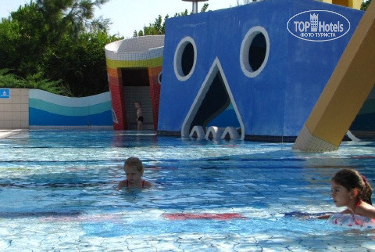Вода чистая и очень теплая (из-за жары)-температура воды 30 градусов как и в море(мерила).Олимпийский бассейн и его окрестности очень понравились детям.Дочери маленький(40 см глубина), сыну глубокий(220 см глубина) -около этих бассейнов стоят шезлонги под плотными навесами-лучи не проходят. Бассейны чистятся ежедневно(купание в них разрешено до 19 часов-потом их чистят).Есть еще бассейн 140 см глубина-нам не очень понравилось-в нем проходит аквааэробика-рядом бар-думаю,это бассейн для ленивых(шучу)-"все под боком" -около него всегда играет музыка ,но музыка играет и около олимпийского бассейна-только тише.