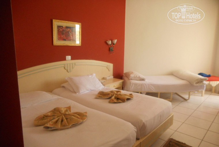 Путёвку покупали у Санмара, перелет Metrojet. В отель приехали в 19.00., нам одели браслеты и отправили на ужин. Пришли с ужина, конверт с ключом от номера был готов, и на нём уже был указан номер 5716. Здесь на сайте пользовалась услугой "Я еду", все свои пожелания оставляла Ирине. И желательные корпуса размещения, и двуспальную кровать, фрукты в номер и поздний выезд из номера. Ресепшионист поведал мне, что номер очень хороший, 2 этаж, вид на бассейн, рядом ресторан, ресепшн, анимация и все дела, мол отблагодарите, чем не жалко. Не жалко мне было шоколадку Алёнка и 10 баксов. Хотя мне кажется, в этом полностью заслуга Ирины, а не ресеншиониста. Пришли в корпус 57, посмотрели номер, да номер, как номер, всё работает. Позже позвонила Ирина и поинтересовалась, всё ли нас в номере устраивает и двуспальная ли кровать? Но у нас были раздельные кровати, но мы уж не стали требовать другую, сдвинули свои. При заселении в номере есть 1,5 литровая бутылка воды, далее воду надо наливать из кулеров. Но извините меня, пить её не реально, она с каким-то неприятным привкусом. Вечером пошли в город, там закупились бутилированной водой. На следующее утро встреча с гидом Ахмедом. Второй раз еду с Санмаром и второй раз мне категорически не приятен их отельный гид. Попросил поднять руки тех, кто впервые в Шарме. Таких оказалось большинство. И тут началось впаривание экскурсий, говорил, что экскурсии у других покупать нельзя. Но коронный его перл меня развеселил, он сообщил всем, что медстраховка за территорией отеля ВООБЩЕ НЕ ДЕЙСТВУЕТ! Уважаемый гид, страховка действует на всей территории Египта! Сделайте себе пометочку. Цены, кстати, у туроператора очень приемлемые, Вы не поверите, почти как на улице. Например Иерусалим у Гены и Чебурашки стоит 70 баксов, у туроператора 65. Время определиться с экскурсиями даёт часа 3, не больше. Всё выбирать нужно быстро и платить быстро. Если ничего не покупаешь, теряет к тебе интерес. В общем, у гида нет цели помочь тебе в незнакомой стране, и сделать комфортным твой отдых. Цель у гида одна - впарить экскурсию.