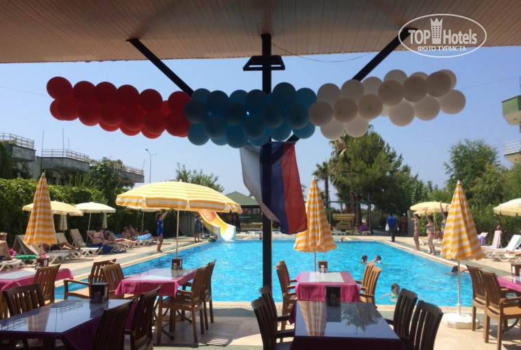 Отдыхали с падругой в августе, разместили быстро, все расказали где поменять деньги, где базар, магазины, где что находится в отеле, было очень приятно, что нас так встретили, и делили внимание. Зато на следующий день былв всречя с гидом, ничего не рассказал сразу начял предлагать экскурсии, и когда мы отказались, начял нас пугать и хамить.... Номер дали на четвертом этаже, нам все показал Сулеман, принес чемоданы. Номер стандартный, без излишеств, но все все есть и работает. Отель небольшой удобный, все рядом, ресторан, бассейн большой, а самое главное море по подземному переходу и вот море!!! Кстати из номера море тоже видно и вечером на болконах мы много раз наблюдали закат. На море шезлонги и матрасы всегда были, натянутые тенты, не нужно бегать за зонтиками, есть песчаный вход в море. Мы все время поводили на море, а зачем мы сюда приезжаем? Еда как во всех тройках, нас устраивало, очень удивдялись, когда некотлрые жаловались, что есть нечего, и не вкусно, но при этом с полными тарелками по несколько раз возращялись с раздачи, и на столе после этого гора пустых тарелок, конечно "все включено", а потом" у вас нет случайно мезима?".....да и с алкоголем тоже самое, "все плохо", вечером а то и в обед, уже "чуть тепленькие", без посторонней помощи дойти до номера не могли. Так что дорогие соотечестенники, нечего на зеркало пинять, коли.... Один мужчина мне ответил, а где еще такая "халява" есть? Мы алкоголь не птли, есть минеральная вода, кола, фанта, спрайт, чай, кофе, вода. Персонал приветливый, дружный, аниматор Джино, хорошо говорит по русски, нам рассказал, что раньше было еще лучше, сейчас, многие турфирмы не расчитыватся с отелем, и туристы отдыхают в долг, с трудом понимаю как можно за такие денги которые мы заплатили туроператору и (которые они не получили) выжить и работать! Нам все понравилось, спасибо персоналу за хороший отдых! И удачи им в это трудное время.
