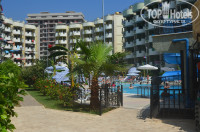 Территория отеля не большая: бассейн в виде гитары (глубина до 190 см), бассейн для детей (детям по колено), бассейн с водной горкой. Водная горка включается на 1 час 2 раза в день. Лежаки свободные были всегда. Но, как я понимаю, такое раздолье возможно лишь не в сезон!