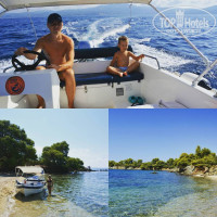 16. Водные развлечения. Мы арендовали в местном дайвинг клубе катер, вот это я очень рекомендую. Стоит это удовольствие 100 евро плюс 25 бензин на 4 часа, лодка довольно быстрая, можно прокатиться с ветерком по морю, посмотрели остров Черепахи, у него оказывается есть еще и голова, поэтому он так и называется. Проплыли вдоль Ситонии, там куча диких бухточек с песком, где можно уединенно покупаться в чистейшей воде. Весь полуостров утопает в зелени, людей почти нет. Купались в открытом море. Подобная экскурсия называется «Голубая лагуна», только вывозят там группой и стоит она для троих 135 евро. Здесь же ты сам себе капитан. Привозят-увозят в марину тебя прям из отеля, очень приятные ребята. Также на пляже можно покататься по записи на водном велосипеде, есть лыжи, таблетки, серфинг, ну как обычно.