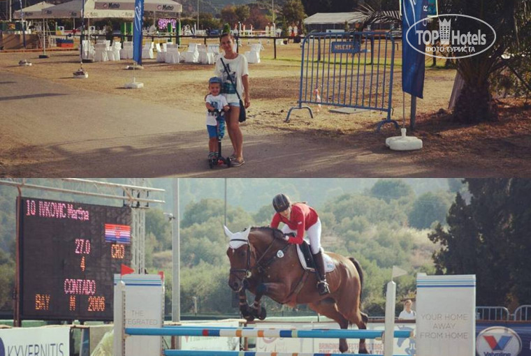 15. Что посмотреть. Никакие экскурсии мы не брали, с ребенком не хотелось ездить на целый день куда-либо, а короткие нам не понравились. Брали машину на целый день, здорово покатались по местным городкам, съездили на соседнюю Кассандру в Потидею, там море гораздо хуже, кстати, пообедали в классной таверне «Марина». Заехали в древний город Олинтос, в музей в Полиджиросе, но он был закрыт. Посетили Нео Муданью, пляжи которые встречались по дороге. Вобщем ненапряжно покатались целый день, посмотрели немного Халкидики. Также рядом типичный курортный городок Нео Мармарас, можно дойти вдоль пляжа 1,5 км от отеля либо из соседнего отеля каждый час ходит кораблик за 2,5 евро, очень приятно прокатиться. Также каждый час от отеля ездит паравозик по местным дорогам, заезжает на винодельню, где можно купить вино. Отель постоянно проводит различные мероприятия, мы попали на чемпионат балканских стран по прыжкам на лошадях, он шел три дня. Все хорошо организовано, много лошадей и красивых девушек, я не сильно разбираюсь, но мне показалось что уровень соревнований был довольно высокий.