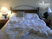 Нам достался М14 с балкончиком на втором этаже. Комната дабл довольно большая, кровать широкая - но с одной стороны явно сломана, провисает до пола. Пыли не было, и в целом внутри убрано нормально, но ванная занавеска прямо рыжая от плесени (фото), на кафели в ванной из-за этой же плесени можно играть в шахматы, так там черным разделены плитки (фото), деревянное окошко-сетка сломано (фото), сетчатую дверь на балкончик кто-то облил кофе, а уборщик решил, что это красиво (фото)... Матрас с тахты на балкончике (уютное пространство два на два метра со столиком, стулом и тахтой) тоже оказался весь в старых пятнах, пыли и грязи (фото).