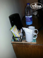 В качестве комплимента при заселении предоставляется также набор чай-кофе (чай - дешевый Дилмах ну в очень респектабельной упаковке; кофе - Нескафе) и бутылка воды. Ложки, что характерно, пластиковые))