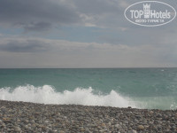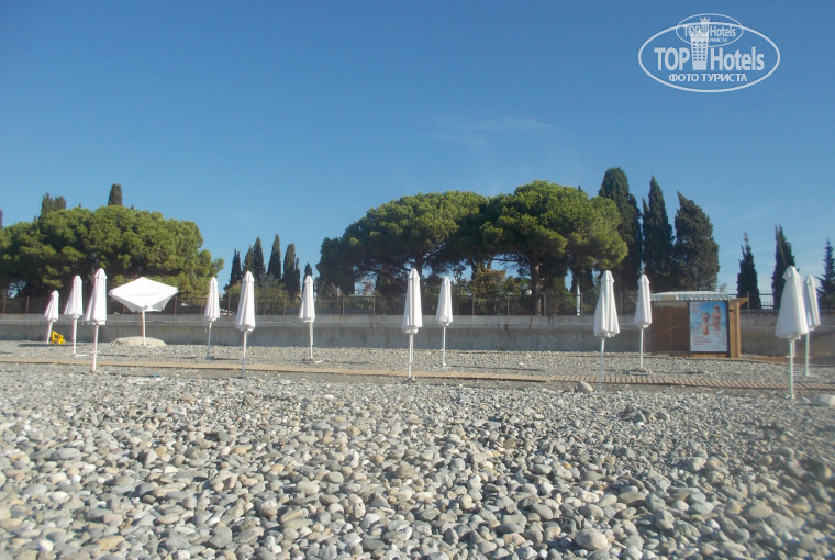 Пляж галечный, люблю галечные пляжи, галька крупная, многим могут понадобиться тапочки, их продают на каждом углу за копейки, любых размеров. Мы заходили свободно без тапочек, абсолютно комфортно было, но видела много людей, которые без тапочек реально зайти не могли, им прямо больно было, поэтому тут уж каждому свое. Есть кабинки для переодевания, мороженое и попить можно купить рядышком. Пляжных полотенец в отеле нет, мы взяли свои.
