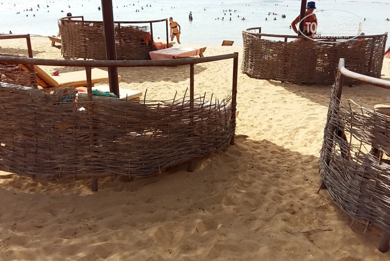 На море нас ждал горячий песок, теплая морская вода и деревянные, неподъемные лежаки , причём многие из них сломаные. Так же и матрасы были далеко не первой свежести и порядком истрепавшиеся. В центре пляжа пункт выдачи и приёма полотенец. Выдать полотенца нам вежливо отказали, так как на часах уже было 15-10. А выдача чистых полотенец с 7 до 15 часов, ну и соответственно прием с 15 до 17 часов. То есть нужно или в пять часов уже сдавать полотенца и уходить с пляжа, либо купаться до 18 часов, но на следующий день пользоваться этими же полотенцами. Нам показалось это достаточно неудобным. Пляж, видимо из за большого количества отдыхающих, довольно грязный. Много окурков, пластиковых бутылок и стаканчиков валяются на песке. Полукруглые ограждения вокруг зонтиков во многих местах сломаны и о них можно легко пораниться. Не знаю кто из отдыхающих восхищался входом в море, но на мой взгляд вход далеко не лучший. В подтверждение этому наши дети в первый же день поцарапали себе ноги об острые камни и ракушки при входе в воду. Первые 3-7 метров это бетонное скользкое дно с редкими, но острыми камнями,коралами и ракушками. Купив в местном магазине так называемые тапочки - коралки, дети натерли себе в придачу мазоли. И потом входя в соленую воду пищали как резанные. Приходилось просто на руках переносить их через это бетонное дно. Дальше идёт приятный песочек и мелководье метров на 30-40. Тут для детей рай. Можно и рыбок в маске посмотреть и поплескаться в лягушатнике.