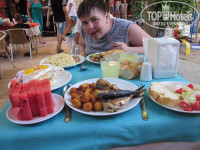 Про еду писать много не буду: лучше конечно приходить к началу обеда и ужина, за мясом придется иногда и в очереди постоять, рыба мне понравилась, шашлык пару раз был, очень много овощей... Фрукты радовали: арбузы, дыни, персики, нектарины, сливы, яблоки, черешня была раз пять.... Хватало! Алкоголь бесплатно 24 часа - очень удобно для любителей расслабиться "горяченьким"! Крепкий алкоголь не пробовала, понравилось пиво и красное вино! На ужин делали коктейли, очень слабоалкогольные, но зато разнообразие! Кофе-машина супер, а так вода в кулере, концентрированные соки из автомата, кола, спрайт, фанта.. В баре на пляже кушали один раз, выбор не велик - помидора, огурцы, гарнир, сырные палочки... и напитки только безалкогольные... Но для желающих расслабиться с пивом на пляже - можно взять в основном баре и по переходу до пляжа дойти прямо со стаканами, никто не запрещает! Радость для курильщиков - курить можно в обеденной зоне под сетью из лиан... Но это и трагедия для некурящих... Будьте готовы, что многие дымят! Убирались в столовой нормально, претензий нет...