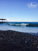 Пляж: находится через дорогу от основного корпуса, пройти можно или перейдя дорогу или по подземке, с коляской по подземке не реально так как есть только ступеньки. Пляж галька, ходить можно в специальной обуви (продают возле отеля по 3$), вход с море с довольно большими камнями. Шезлонгов много и на пляже и на пирсе. Пляж грязный: бычки везде и убрать их довольно сложно (да и наверно не пытаются) так как везде галька и ее не просеять как песок. Дорогие сограждане, давайте не будем сами гадить там куда сами же хотим приходить в чистоту!