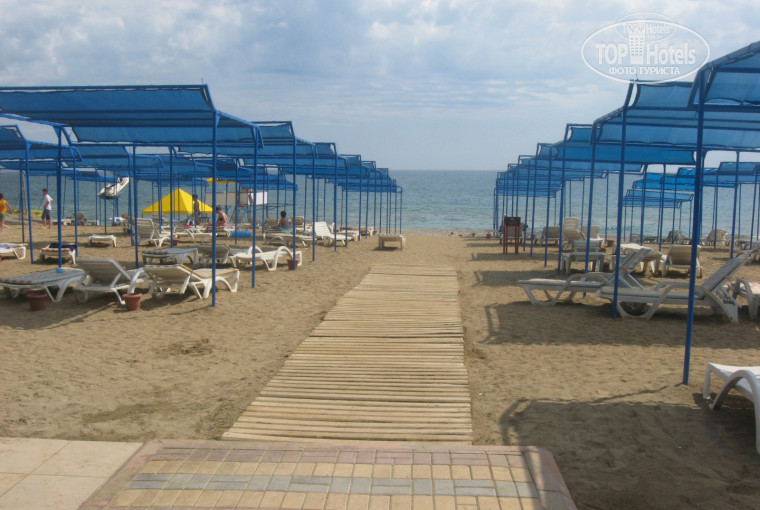 Пляж - галечный, с каменной плитой. Можно сходить на пляж соседнего отеля (вправо) , искупаться с пирса.