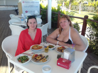 Иногда на пляже обедали. Так как народа в это время на пляже мало (одни русские, немцев мало - но об этом потом), был не шведский стол, а подходил официант и принимал заказ из предложенных им блюд. Еда вкусная. Единственное, чего не хватало, это фрукты. Были апельсины, мандарины, груши и иногда виноград.