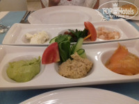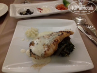 Итак, приехали мы в отел. Заселили нас в течение 10 минут, быстро оформив документы и выдав ключ от номера. Номер располагался в главном корпусе, где лобби бар и ресепшн, на 4 этаже. Войдя в номер, мы обрадовались - чистый номер, новая мебель, белоснежное белье, ванная комнта с душевой кабиной и прочие удобства. Балкон у нас был с видом на бассейн, а с другой стороны виднелся отель через дорогу с великолепной подстветкой в темное время суток. Расположившись в номере и приняв душ, мы отправились на обед. Выбор блюд огромен - два стола только сыра (подруга была в восторге), мясо, курица, овощи, стол маслин и оливок, фрукты. Голодными точно не останетесь. Я консервативна в еде, а вот подруге понадобился весь отпуск в 12 дней, чтоб попробовать все, что предлагали.