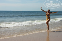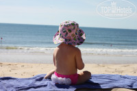 До пляжа пол минуты. Пляж песчаный, море чистое, тёплое. Мы, судя по всему, попали в сезон ветров, поэтому почти каждый день наблюдали сёрферов или не знаю как они называются. Плавают на доске и сверху летит парус. На пляже лежаки с матрасами и крышей из листьев пальмы. На берегу под крышей столики, где с 15:00 до 16:30 можно попить чай-кофе бесплатно. К ним продаются пироженки.