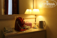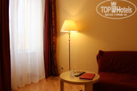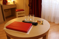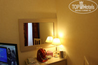 Номер студия гораздо большей площади по сравнению со стандартом, но планировка мягко говоря странная. Огромная пустая прихожая, в котором стоит только вешалка для верхней одежды и такой же, как в стандарте, небольшой платяной шкаф. Его еле хватает на двух человек, он неглубокий и с малым количеством полок для белья, а вешалки для верхней одежды располагаются параллельно к дверцам. И еще одну из полок занимает сейф. С сейфом история совсем смешная. Я попробовала убрать его с полки вниз под ту часть, где расположены вешалки, и оказалось что весит он от силы килограмма полтора. То есть, если злоумышленник захочет вас ограбить, он может просто положить этот «сейф» в пакет и унести из номера. А потом просто вскрыть его консервным ножом в спокойной обстановке!)))) Но тот минус пошел на пользу, полка была легко освобождена! Места в прихожей столько, что можно поставить и еще шкаф (номер -студия рассчитан на 2+1 гостя), и банкетку, чтобы переобуться при выходе из номера на прогулку, и подставку для чемоданов (таковой нет вовсе, мы ставили чемоданы в прихожей в углу просто так). Сама комната нормальной площади, но чудной конфигурации. Между кроватью и гостиной зоной стоит колонна. Форма комнаты со стороны кровати – усеченная выступом внутрь комнаты, из-за чего пространство, в котором стоит кровать (очень хорошая, широкая с шикарным ортопедическим матрасом), недостаточно для двух прикроватных тумб, поэтому одна тумба стоит у кровати, а вторая - перед колонной в гостиной зоне. Там еще небольшой раскладной диван-кушетка, маленький круглый журнальный столик, стол-тумба под телевизор с мини баром и туалетный столик с зеркалом, половину которого занимает таблеточная кофе-машина. В качестве комплимента нам оставили три таблетки с кофе, остальное - покупайте в лобби-баре.