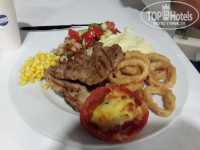 ПИТАНИЕ: отличное, вкусная разнообразная еда, много перекусов в саду (и мясо и мороженое, лепешки, кондитерка), мы поправились, приходилось есть даже когда не хотелось :) НО есть небольшие минуса: пюре порошковое ужасно невкусное, солонки всегда забитые, места бывало трудно найти, неудобно бегать с тарелками по разным залам. Тарелки и скатерти не идеально чистые :) На барах много алкогольных напитков, пиво нормальное (к нему орешки беспл, если попросить), любые коктейли. Вода на территории в холодильнике - теплая и холодная, бери сколько хочешь.
