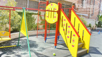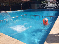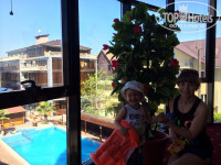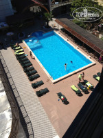 Территория маленькая, но отлично организованная: поместился и бассейн с подогревом и гидромассажем, и бар у бассейна, и детская площадка. Вид из окна был на соседний пансионат Солнышко.