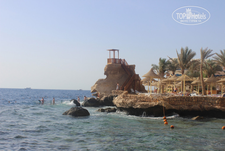Пляж у отеля достаточно протяжённый, многоуровневый, находится на спуске со скалы. Красивый. Спуститься можно в нескольких местах по ступенькам, по пологому асфальтированному спуску, а также на лифте. Имеются 3 понтона: первый - бетонный, длинный, затопленный в воде (при входе - по щиколотку, в конце - по пояс, далее-обрыв), будьте осторожны, может быть скользким; второй - в виде пирса, обитый рейками, с лестницами для спуска в воду (на наш взгляд, самый удобный); третий - такой же, как и первый, только намного короче. Есть небольшой "лягушатник" для детей с пологим входом, но там много камней. Есть бар, ресторан на пляже. Через день в нём можно обедать.
