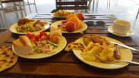 Еда. Каждый день одно и то же, разнообразия нет. Но вкусно. Мясо и хлеб есть, так что твердая 4. Ресторан хороший, чистый. Есть столики на улице.