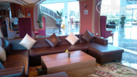 Убил пляж(метров 500 идти) и бассейн. Было такое впечатление,что шезлонги ,матрасы и зонты просто достали с прошлого сезона и расставили.Большинство в подтеках и грязных пятнах(((Из-за того,что пол возле бассейна не моется,грязными ногами пачкаются матрасы.Полотенца тоже выдаются(по карточке) короткие и жалкого вида всех цветов.В конце даже выдали такие же как и в номере.Утром после завтрака приходилось самим ходить за матрасами и зонтами
