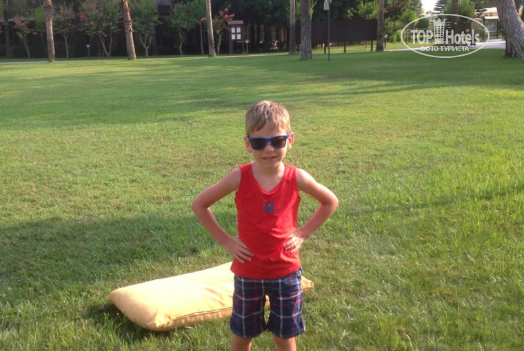 Отдыхали семьей. ребенок 5 лет и взрослый сын. Так как задержали рейс из Харькова, то добрались до отеля уже часа в два ночи, заселили в течении 15 минут. мы были последние, долго писали видимо., Так как мы жили на вилле. то подъехал электрокар и нас с вещами отвезли к нашему временному жилищу))) Спросили за перекус, так как целый день на сухомятке и детвора уже проголодалась, ресторан открыт всю ночь и можно зайти что нибудь перекуснуть. Младший заснул пока добирались до Сиде, и был конечно в непонятке. но все таки пошел с нами в ресторан, не захотел сам в домике сидеть. Кстати добираться с аэропорта часа 1,5.. и еще по дороге делают остановку чтобы могли начать тратить деньги( шаурма по 4бакса. фанта 3) Вилла классная. всем советую, но на двоих ее наверное нет смысла брать. разве что оплатить полностью))там две комнаты, в одной большая кровать и две односпальные в другой комнате. душ , гора подушек чтобы валяться на траве. вобщем двух комнатная такая квартирка)) кондиционеры и телевизоры в каждой комнате. Вилла двухэтажная. и будьте готовы к тому, что над головой будут постоянно грюкать и топотеть соседи, как это было у нас, еще лестница проходит у окна спальни и наши соседи с 6,30 утра уже табуном по ней спускались)) Так у нас семья совиная)) мы до пол ночи гуляли , а утром хотелось хоть до 8,00 поспать. но не давали).У нас вилла выходила на большую поляну 4019 номер, это самое удачное расположение. поляна была в нашем распоряжении, можно фоткаться хоть целый день, что мы иногда успешно и делали)) С утра пошли в ресторан, так как дети были первый раз то конечно от изобилия еды теряешься. к концу недели уже смотреть не могли)) Да, забыла написать что мы ехали сюда изначально из за малого, как в детский отель, поэтому ничего супер пупер не ожидали, есть детское кафе для малышей специально, что очень удобно, наш ел с нами всегда но иногда я там брала ему паровой омлет и сосиски которые он клянчил время от времени. там есть телевизор с мультиками для деток посуда разноцветная и маленькие столики, так что у кого малыши очень удобно. Всего конечно не опишешь, все очень приветливые. улыбаются, ребята официанты бегают стараются, на ужин выхоит шеф повар, все контролирует, другой из арбузов и дынь вырезает всякие шедевры)) Еды впринципе много. даже ролы делали. но они какие то непонятные. гриля много( форель, курица, скумбрия, кебаб( это что то необыкновенное) спасибо шефу) омлет на завтрак , панкейки с шоколадом. Омлет с луком кто любит, я не очень люблю . поэтому брала себе паровой. . С инетом как везде, постоянно нужно вводить пароли, и бегать его ловить, На счет пляжа, так как это все таки вторая линия, то едет от отеля шатл. каждые 10-15 минут, если не хочется ждать то вдоль озера с булочкой и рыбок по дороге покормить , тоже 10-15 минут не спеша . Мы ездили один раз , в основном ходили пешком. Хочу так же отметить нащего гида, Азад его зовут. Классный парень. все очень доходчиво объясняет, отдельное спасибо ему за то , что организовал нам поездку в Израиль, хоть и утомились.но это круто было. В общем отдых понравился. жаль . что мало дней было, мы вырвались на недельку, а еще и сутки выпали из за Израиля, толком не по загорали, но все равно классно.