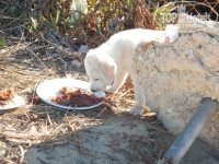 Видели на пляже один раз взрослую собаку и несколько раз трёх щенков. Щенки игривые, но к людям не подходят - убегают в кусты у забора. Их подкармливают. Один щенок, видимо мальчик, притаскивал другим еду и тяфкал на меня, защищая других, когда я приближался )))
