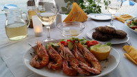 Питание. Мы брали только завтраки, т.к. заранее знали, что будем много передвигаться по острову и за его пределами и понимали, что не всегда будем попадать на ужин в отель, так и получилось. Но оценить питание в отеле мы всё равно смогли. Завтраки нас вполне устраивали, не могу сказать, что еды было мало - наличие двух видов каш одновременно уже даёт возможность не остаться голодным. Кроме этого всегда был свежий йогурт, хлопья, мюсли, омлет, мясная нарезка, сыр 2-х видов, овощной салат, круассаны, джем, арбуз и ещё какие-то блюда, которые я даже не запомнила... Скажите, у кого-то дома завтраки бывают разнообразнее? Соки и вода из автомата, очень приличный кофе... Всё свежее, вкусное, посуда чистая, чашки вместительные и удобные, в общем, минусов мы не нашли. В те дни, когда удавалось обедать и ужинать в нашем ресторане брали в основном рыбу и морепродукты, очень нам нравились мидии в винном соусе, осьминог и креветки на гриле. Греческое домашнее вино - на любителя, а вот разливное пиво местное нам очень понравилось. Цены в среднем на 1-1,5 евро дешевле, чем в тавернах в районе порта в центре Беницеса. В Зорбасе цены примерно совпадают с отельными, но меню несколько отличается (например, иначе готовят мидии), и напечатано оно только на английском и греческом языках. В Зорбасе мы попробовали вкусную рыбу саргос, достаточно крупная рыба, готовят ее там целиком, мужу очень понравилась.
