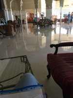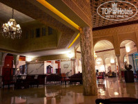 В отель прибыли около 10 утра. Заполнили карточки регистрации, нам одели браслеты, далее сказали, что ждите пока ваш номер подготовят. У нас был номер в новом корпусе - корпусе талассо терапии. На ресепшн работают очень приветливые девушки, моя мама - не любитель лифтов и прочего, и поэтому она сразу попросила номер пониже, на что нам сразу ответили "да, конечно, никаких проблем", и мы получили номер на первом этаже корпуса, и это при всём при том, что мы не заплатили ни динара! Обменяли деньги. Говорят, что курс немного меняется в течение дня, но в этом нет ничего страшного. Пол динара больше или пол динара меньше - как для нас, это не проблема. В то время пока номер готовился, мы оставили чемодан стоять у стойки ресепшн, а сами пошли осматривать территорию. Как нам сказали, полотенца не выдают, но на территории отеля есть небольшой магазинчик, где можно из купить, на что мы сразу его посетили. Купили 2 больших полотенца за небольшие деньги. ТЕРРИТОРИЯ отеля очень зелёная, прям очень зелёная. Цветы, стриженные кустарники, когда идёшь на пляж - это все очень радует глаз. Вернулись обратно нам не ресепшн, номер был ещё не готов, и мы пошли на обед. Могу сказать, что в этом на не повезло. Мы пришли к самому началу обеда, и как всегда Русские всей толпой рванули к еде. Это первый и последний раз, когда мы искали столовые приборы, стояли в очереди и искали место себе. Да и вообще, больше в главном ресторане мы не обедали, обедали постоянно в ресторане у бассейна, там всегда мало народу, что в начало обеда, что в середину, что в конец.
