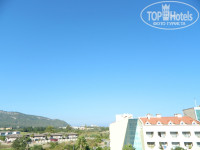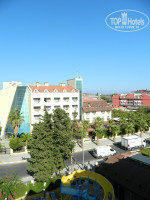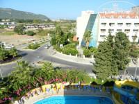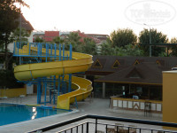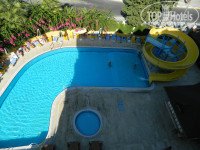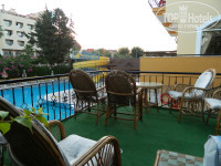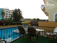 Территория отеля маленькая, я бы сказала даже крошечная! 5 этажный главный корпус (говорят был ещё один через дорогу, но мы не видели), в цоколе столовая, хамам, зал для пин-понга и детская комната, тут же перед столовой бассейн с лежаками и горкой и бар, на уровне 1 этажа есть небольшая терасса со столиками.