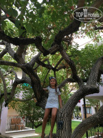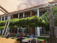 Готель на великій площі. Територія доглянута.Багато тіні ,створеної арками дикого винограду вздовж доріжок і над лежаками. Пальми і лимонні дерева.Багато квітів.