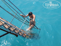 Территория отеля маленькая, но для семей с детками, это хорошо. Не нужно бегать на большие расстояния. На территории располагаются три бассейна, один из которых крытый. У каждого бассейна имеется отдельный лягушатник для малышей. Итого их тоже три. Вода хорошо хлорирована. Мы больше конечно купались в море, которое было просто необыкновенным! 29-30 градусов, голубое, соленое до жути и чистое! Море это сказка! Пляж расчищен от камней. Их есть только пара штук в глубине(это для ныряльщиков) и там очень много рыбок. они неяркие, но достаточно разнообразные. Маску брать обязательно! Другой живности в море не наблюдали.