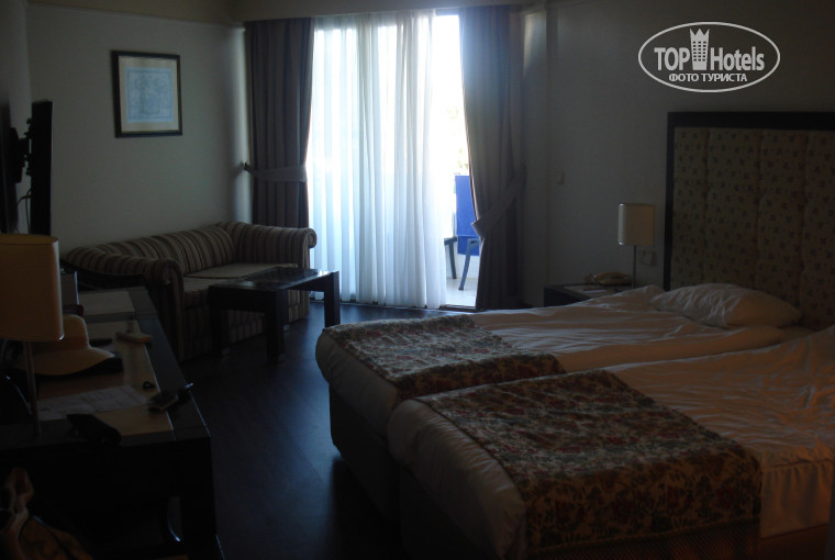 3. Номер. Номер стандарт в основном здании (есть еще корпус Гарден), 117, 1 этаж (по уровню как 3), вид на бассейн основного корпуса (есть еще бассейн у Гардена). Мебель не совсем новая, но меня это не напрягало. 2 кровати, диванчик, кресло, 2 тумбочки, журн.столик, ЖК телевизор (1 русский канал - ТНТ), холодильник (питьевая и минеральная вода присутсвовала), кондиционер, телефон. В ванной - фен, туал.бумага, шампунь и мыло. На балконе - пластиковый столик и 2 стула. Корпус Гарден по внешнему виду приличнее и новее выглядит, но балконы там какие-то совсем маленькие. К слову, я задавала вопрос здесь на сайте и в отеле по поводу Эко-рум, но здесь ответа не получила до сих пор, а в отеле мне сказали, что это может быть номер на цокольном этаже в Гардене без балкона, а также в основном здании рядом с ресепшен есть несколько номеров - там вид в стену.