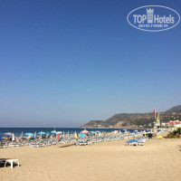 Действительно достойный, много места, душ, туалеты, переодевалки, бары с вай-фай. Тянется вдоль уютной набережной, каждый день можно выбирать, где отдыхать. Мы брали 2 шезлонга и зонтик за 15 лир на весь день. Пару раз лежали на своей циновке и полотенце.