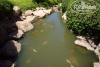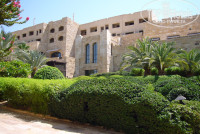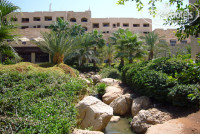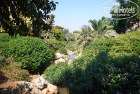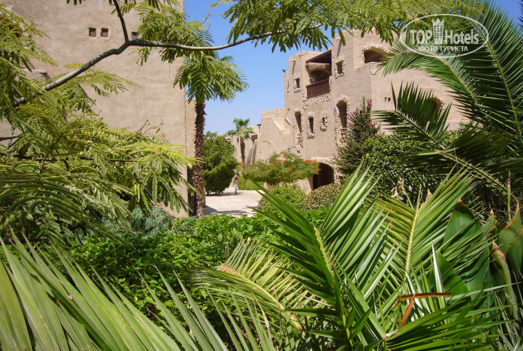 От территории отеля мы были в восторге. Архитектура отеля выполнена в традиционном арабском стиле, а сам он стилизован под медину. Административное здание являлось стенами старого города, в одном месте возвышалась высокая башня. А город как бы состоял из множества двухэтажных бунгало. Многие из них были затейливо соединены между собой, то тут, то там обнаруживались замысловатые коридорчики, альковы, переходы с арками, внутренние дворики с фонтанами. Очень много зелени. Место между вторым и третьим рядами бунгало напоминало какой-то сказочный лес. Всю землю, за исключением пары тропинок покрывал ковер из кустиков, трав и цветов из которого возвышались пальмы. Посреди этого великолепия текла небольшая речка. Что интересно, начиналась она в главном корпусе, там даже был небольшой водопад, потом, уже на улице, она немного расширялась и там, в озерце, плавали рыбки, далее ручей протекал мимо бунгало и впадал в бассейн, который находился примерно посередине между административным зданием и морем.