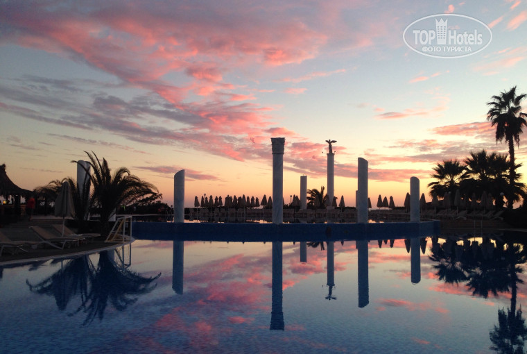 На данный момент нахожусь с семьёй (3 взрослых) в отеле, отдыхаем уже ровно неделю. Автобус привез нас в отель около 17 часов, при входе женщинам подарили по розочке. На ресепшн была суматоха и очередь, много туристов приехали в одно время. Отдали свои паспорта и ваучеры молодому человеку на ресепшн, чтобы он снял копии, паспорта он вернул, но потерял ваучер, попросил присесть и подождать некоторое время. Во время ожидание рассмотрели интерьер первого этажа, выпили шампанского (лимонад при входе оказался не очень). Поселили нас в бунгало, стандартный номер с балконом: две сдвинутые широкие кровати и дополнительное место с матрасом такого же размера как и у кроватей, телевизор, минибар, на балконе два пластмассовых стула и столик, ванная чистая. Хочется отметить, что качество постельного белья оставляло желать лучшего ( возможно, только в бунгало): покрывало тонкое и старое, им же надо и укрываться. Убирали в номере нормально через раз. Полотенец было по два на человека (банное и для лица), потом ещё одно для ног положили, меняли их не каждый день, чего мы сразу не заметили, а только когда они уже были изрядно грязные - их просто аккуратно развесили грязным вовнутрь. Ситуацию спасли 2 евро оставленные перед следующей уборкой, даже постель поменяли. Минибар пополняли регулярно: кола, соки, пиво, вода, чипсы, орешки. Территория отеля просто огромная, куча бассейнов (также 2 ВИП бассейна за 20$ день), много фруктовых деревьев, чисто и красиво. Большое количество теннисных кортов, до 11 бесплатно, после надо платить за ракетки. Услуги Спа достаточно дорогие, дороже, чем предлагает гид. Пляж большой и чистый, нам больше нравилось купаться возле пирса, но так как 27 у отеля конец сезона лежаки и зонтики убрали. Полотенца выдают по карточкам на пляже. Спортзал в отеле просторный, почти никого нет, все основные тренажёры присутствуют, также есть полотенца и кулер с водой. Шведский стол достаточно разнообразный, есть блюда на гриле, в четверг попали на рыбный ужин, было много морепродуктов. Официантки более резво убирают и приносят напитки в основном зале и на главной террасе. В лобби барах присутствуют все основные виды алкогольных напитков и "орешки" вперемешку с нутом и горохом)) аниматоры работают хорошо, вечером идёт сначала детская программа, потом взрослая, у бассейна в течение дня. В целом впечатление очень хорошее, чистая красивая огромная территория с развлечениями на любой вкус!