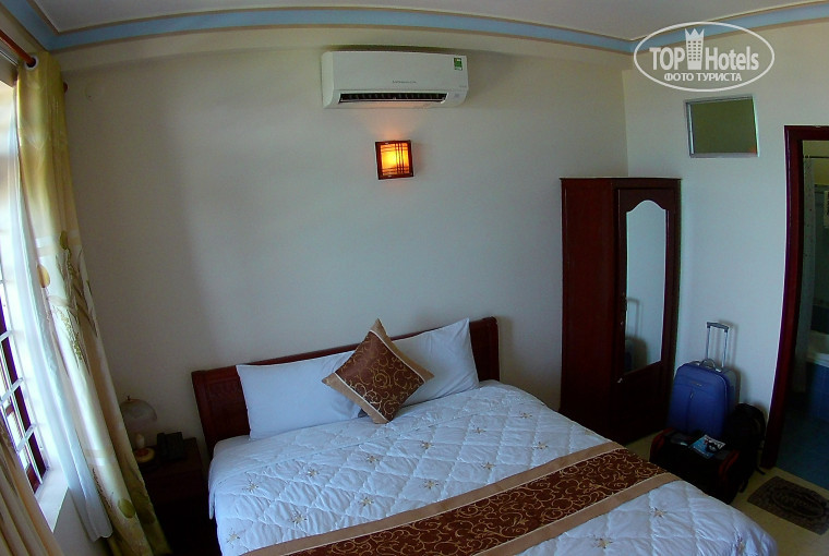 Сначала нас заселили в номер по-моему 804 без балкона, там было не очень, но мы настояли и попросили на ресепшене номер с балконом. Очень добрый господин вьетнамец объяснил нам что на следующий день номер 801 с балконом должен освободиться. Так всё и вышло на следующий день после 12.00 нас без разговоров заселили в номер с балконом, с чудесным видом на весь город. В отеле нам понравился персонал, все очень добрые и отзывчивые, ни разу у нас ничего из номера не пропало. Просто ценные вещи лучше прятать не на виду оставлять и всё будет ок. Самое крутое в этом отеле - это вид с балкона. Сам номер очень уютный, хоть и без особой роскоши, в телевизоре на 50-й кнопке был первый канал. Кондиционер работал отлично, убирались в номере каждый день. Мы были без питания кушали в русском кафе трактир, если выходишь из отеля направо идти минуту. Главное там научиться переходить дорогу, для этого надо пропустить все машины а потом не спеша шажками постепенно идти подняв руку, тогда мотобайки вас объедут. Так же рекомендую взять с собой нож что бы чистить фрукты которые вы купите на улице, только не оставляйте кожурки на столе а то через несколько часов к ним прибегут муравьи толпой.