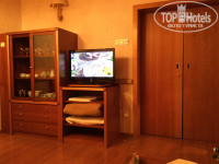 Номер был двухкомнатный люкс. Просторный, с отличной мебелью, большой холодильник, много шкафов-комодов-тумбочек, огромная кровать шириной метра 2, раздвижной стол, 2телевизора с большим количеством каналов, много посуды, мягкие стулья, торшеры, куча полотенец, халаты, тапочки, все очень чисто и уютно, большой балкон с видом на море, чайника/кипятильника в номере нет, хотя есть сервиз. Может можно было попросить принести, но мы без этого обошлись.