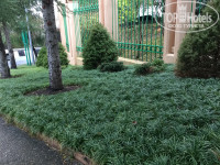 Территория шикарная, много растений, запах опьяняющий даже зимой. Отбитая плитка на улице-так нам на неё плевать. В целом здание очень ухоженное, чистое и красивое. Внутри все очень шикарно. Единственный для меня минус-вечером не вся территория освещается, не удобно гулять.