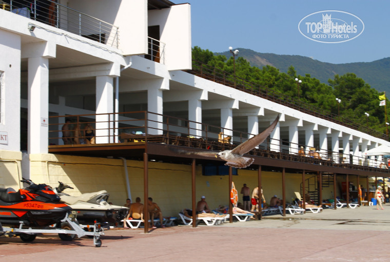 Добрый день! Отдыхали в Солнечной в августе 2016 г. всей семьей. Отель находится от моря на расстоянии 50м. Пляж "Солнечной" большой, много лежаков, всегда можно было найти место, в основном на солнце. Пляж представляет собой бетонную плиту, с лесенками для спуска в море, что удобнее, чем заход по камням. Территория отеля довольно большая. Все красивое. Каждый день были развлечения для детей. На территории отеля находится бассейн, бесплатный для гостей и платный для сторонних отдыхающих (200 рублей - целый день) . Рядом с бассейном находится кафе "Избушка", работающее целый день, в котором каждый вечер, до полуночи, была живая музыка, дискотека. Так же на территории есть множество "палаток" с разными товарами,начиная от еды( мороженное, фрукты и т.д. ) до одежды.